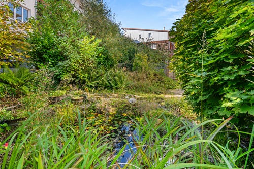 Die angebotene Gartengeschosswohnung folgt einem durchdachten Konzept: Offenheit und Weitläufigkeit im Wohn- und Essbereich sowie gleichzeitig diskrete Rückzugsorte für Ruhe und Entspannung. Hier findet jedes Familienmitglied seinen Platz – sei es zum Arbeiten, Spielen oder Musizieren. Über die großzügigen Terrassen erhalten Sie einen nahtlosen Übergang zu einer grünen Oase mit Teich. Hochwertigkeit zeigt sich in jedem Detail: Industrieparkett aus massiven Hochkantlamellen in allen Wohnräumen, eleganter Sanitärbereich, maßgefertigte Fensterlösungen und eine luftige Deckenhöhe, die dem Interieur Großzügigkeit und Leichtigkeit verleiht.